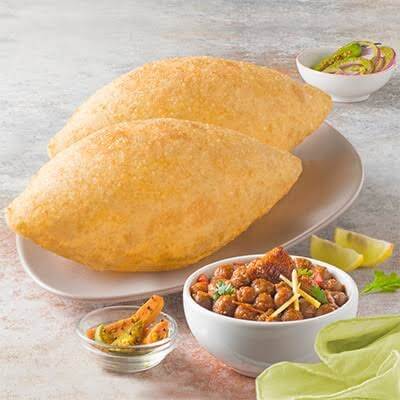 Fluffy fried bread served with spiced chickpea curry, onions, and pickles