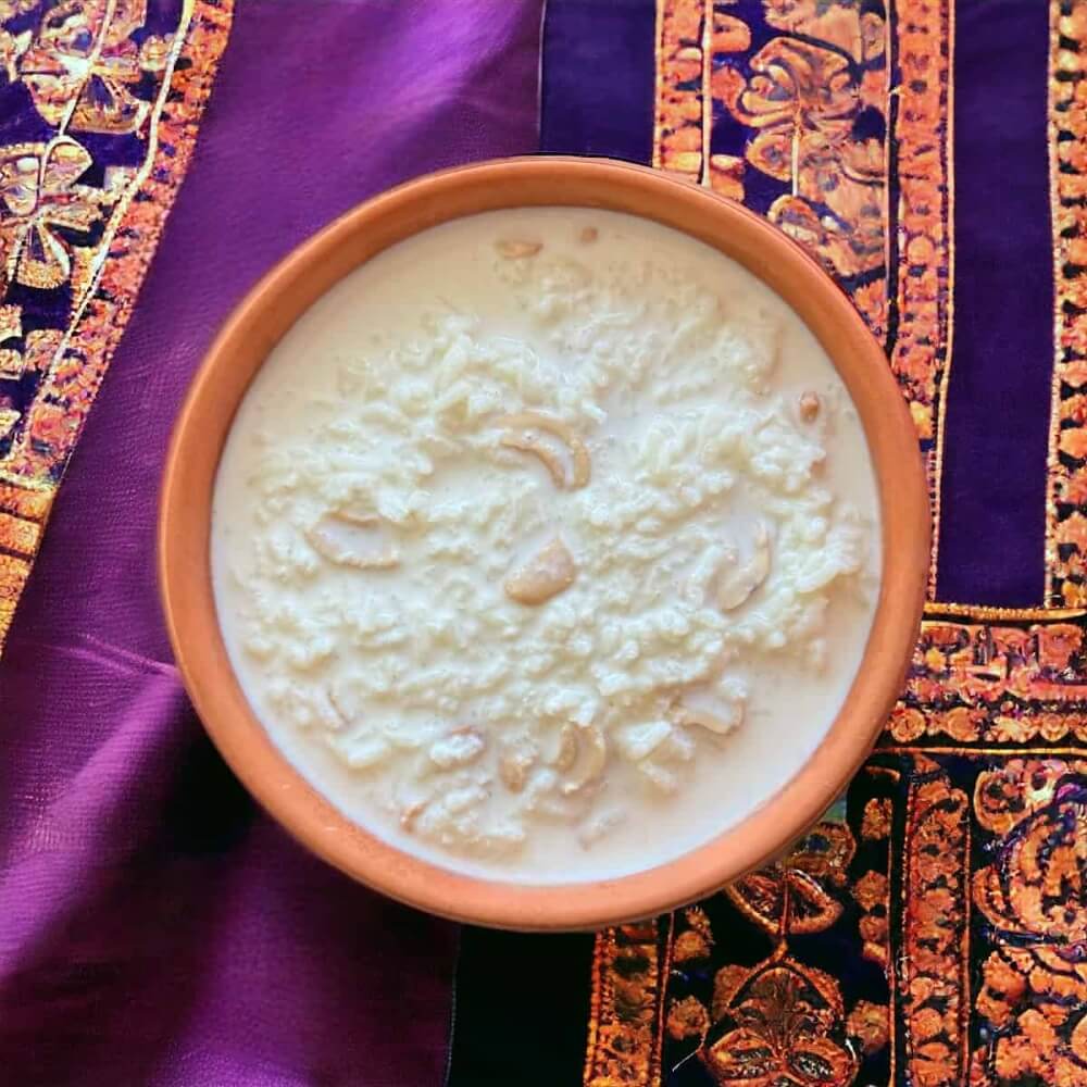 Creamy rice pudding cooked in milk, flavored with cardamom and nuts.